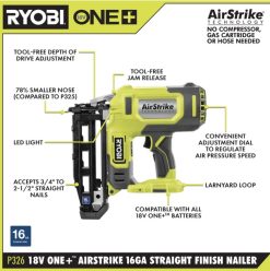 Erweitern Sie Ihr Ryobi 18V One+-System mit dem 18V One+ HP bürstenlosen 21-Grad-Rahmennagler. Die one+ hp-Technologie sorgt durch bürstenlose Motoren, fortschrittliche Elektronik und leistungsstarke Lithium-Technologie für mehr Leistung, Laufzeit, Haltbarkeit und Geschwindigkeit. Genießen Sie den Komfort der Airstrike-Technologie und machen Sie laute Kompressoren, sperrige Schläuche und teure Gaskartuschen überflüssig. Dieser kabellose Rahmennagler bietet sofortige Fahrgeschwindigkeit und die Möglichkeit, bis zu 750 Nägel pro Ladung mit einem 4-Ah-Hochleistungsakku zu schlagen. Mit dem wählbaren Antriebsschalter können Sie zwischen einzelnen sequentiellen und Kontaktbetätigungsmodi wählen, um entweder eine präzise oder eine schnelle, wiederholte Nagelplatzierung zu ermöglichen. Dieser Rahmennagler bietet die Kraft zum Absinkenbis zu 3-1/2″ Vollrundkopfnägeln. Die werkzeuglose Einstellung der Einschlagtiefe stellt sicher, dass Sie die Nägel jederzeit bündig einschlagen können, selbst in den dichtesten Materialien. Das integrierte Luftfüllventil ermöglicht eine einfache Wartung vor Ort. Dies führt zu kürzeren Ausfallzeiten für Sie und Ihr Team, und der integrierte Sparrenhaken ermöglicht eine sichere und einfache Lagerung bei der Arbeit. Der bürstenlose 21-Grad-Rahmennagler 18V One+ HP ist durch die 3-jährige Herstellergarantie von Ryobi abgesichert und beinhaltet den 18V One+ Rahmennagler, 18-V-1+-4-Ah-Hochleistungs-Lithiumbatterie, 18-V-1+-Ladegerät, Sparrenhaken, Gürtelhaken, Inbusschlüssel, nicht beschädigende Unterlage und Bedienungsanleitung.