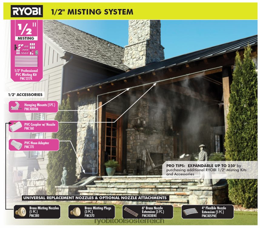 Ryobi-Vernebelungssets und Zubehör sind die einfachste und effizienteste Möglichkeit, für die kühle, komfortable Umgebung zu sorgen, die Sie sich wünschen. Das 5er-Pack flexibler 4-Zoll-Düsenverlängerungen von Ryobi kann anstelle vorhandener Sprühdüsen verwendet werden, sodass Sie die Richtung des Kühlnebels überall hin lenken können, wo Sie möchten. Die flexiblen Verlängerungsdüsen sind speziell dafür konzipiert, in jede Sprühdüsenöffnung mit 10/24-Gewinde zu passen und können für Ryobi-Zerstäubungssysteme mit 1/4 Zoll oder 3/8 Zoll verwendet werden. Diese Verlängerungen verbrauchen nur 1/2 GPH pro Düse. Dieser Artikel ist zusammen mit allen anderen Vernebelungssets und Zubehörteilen von Ryobi nur für die Verwendung im Freien mit kaltem Wasser konzipiert.