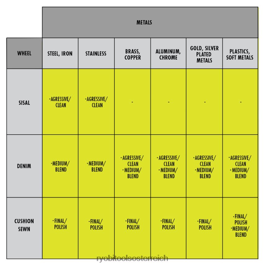 Ergänzen Sie Ihre Werkzeugsammlung mit den 4-tlg. 4-Zoll-Polier- und Polierscheibensatz. Diese Polierscheiben können für mehrere Stufen des Polierprozesses und für eine Vielzahl von Metallen verwendet werden. Diese Räder sind mit Tischschleifern, Bohrmaschinen und Schlagschraubern mit dem mitgelieferten Dorn kompatibel. Für das Beste Ergebnisse bei Verwendung mit dem Ryobi-Set aus Metallreinigungsmitteln. Dieses Set enthält (1) Sisalrad, (1) Denim-Spiralrad, (1) kissengenähtes Rad und (1) 1/4-Zoll-Sechskantschaftdorn.