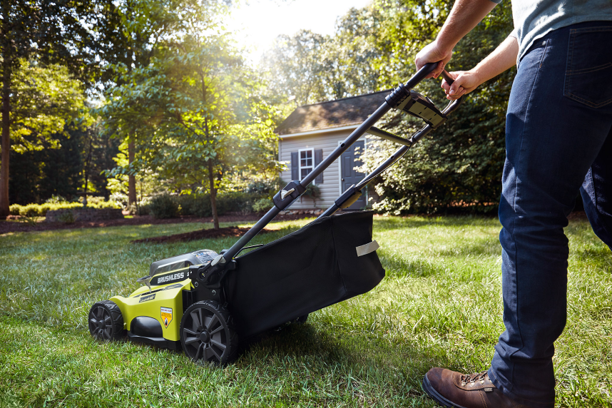 RYOBI 40-V-2-in-1-Rasenmäher-Set mit 18 Schiebern draussen 6V8HV6232