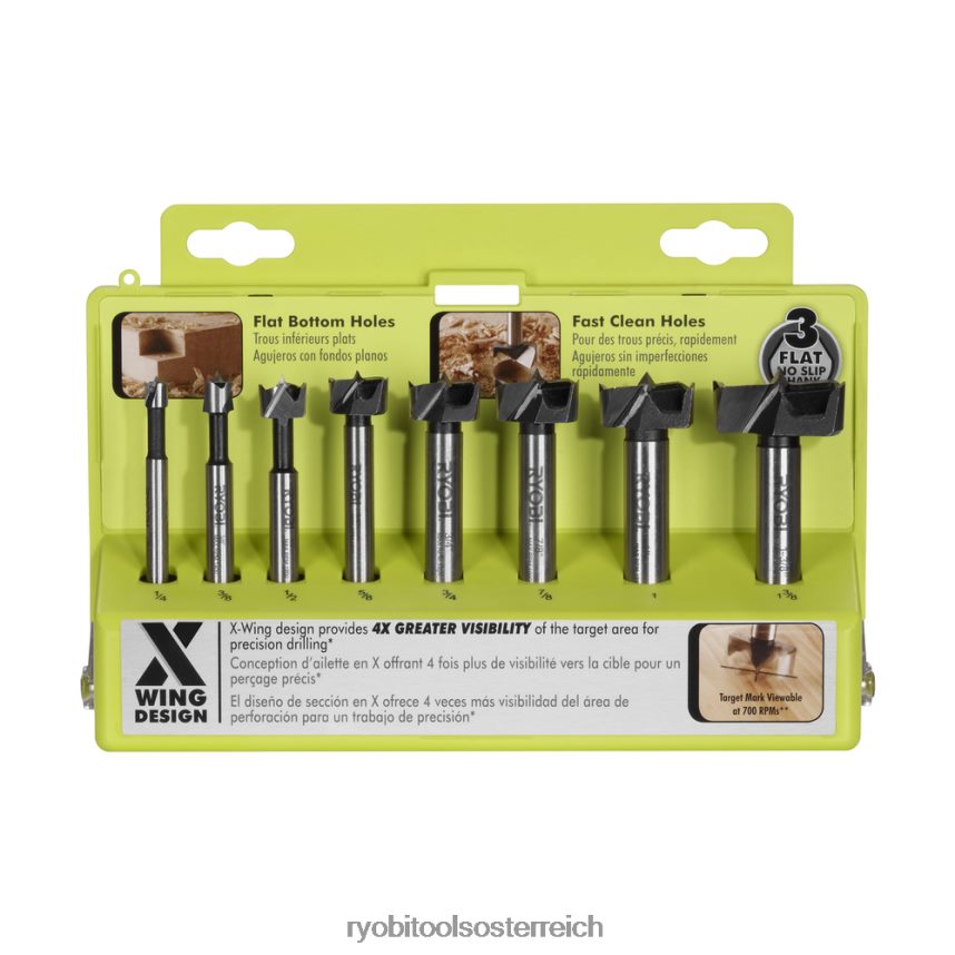 ryobi stellt den 8-teiligen Ryobi-Forstner-Bitsatz vor. Das Set enthält 8 Bits mit flachen Schäften, die ein Verrutschen verhindern, und einem X-Wing-Design für gute Sichtbarkeit.