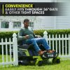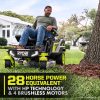 Wir stellen Ryobis ersten Zero-Wende-Aufsitzrasenmäher mit Lithium-Ionen-Akku vor, den Ryobi 80V HP 30″ Lithium Electric ZTR.* HP-Technologie und 80V-Batterien liefern zusammen die Leistung von 28 PS Benzinmotor*, während der Aufwand und die Wartung eines Gasmähers entfallen. Dieser Aufsitzmäher schneidet mit Hilfe von 4 bürstenlosen Motoren und (2) 80-V-10-Ah-Batterien bis zu 1 Acre pro Ladung, mit einem Hyperladegerät, das sich in 1,5 Stunden vollständig auflädt Sie sind bereit für Ihren nächsten Job. Das revolutionäre iDrive-System nutzt eine intuitive Einhand-Joystick-Steuerung, um Objekte einfacher zu manövrieren als ein herkömmlicher ZTR. Der innovative LCD-Bildschirm zeigt Laufzeit, Akkulaufzeit und mehr an, während die Aufsitzmäher-App verfügbar ist ermöglicht die Überwachung der Ladezeit und der Akkulaufzeit aus der Ferne. Die 12-Punkt-Höhenverstellungermöglicht die Wahl der perfekten Schnitthöhe zwischen 1,5 und 4,5 Zoll. Dieser Mäher ist mit dem kompatiblen Bagger-Boost-Zubehör, das den Schacht per Knopfdruck schnell freigibt, weiterhin führend in der Innovation. Das 30-Zoll-Deck und der seitliche Gummiauswurfkanal ermöglichen es diesem Aufsitzmäher, durch ein standardmäßiges 36-Zoll-Tor zu passen, und erleichtern das Manövrieren im Landschaftsbau. Dieser Rasenmäher wurde im Hinblick auf Komfort und Bequemlichkeit entwickelt und verfügt über einen Premium-Sitz, einen USB-Anschluss zum Aufladen von Telefonen, ein Ablagefach und LED-Scheinwerfer. Mobilfunkdienst in ausgewählten Regionen verfügbar. Wenn Ihr Aufsitzmäher Aufmerksamkeit erfordert, kann ein zertifizierter Ryobi-Supporttechniker die Diagnose und Wartung direkt von zu Hause aus durchführen. Bei einigen Diensten kann es erforderlich sein, dass Sie Ihren Mäher zu einem der über 300 Servicezentren im ganzen Land bringen. Dank des bürstenlosen 30-Zoll-Lithium-Elektro-Zero-Turn-Aufsitzmähers mit 80 V PS von Ryobi wird die Rasenpflege nie mehr die gleiche sein.