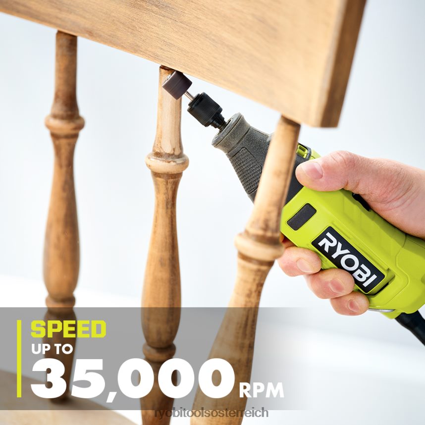 ryobi stellt das 1.2a-Rotationswerkzeug vor. Die drei variablen Geschwindigkeitseinstellungen des Rotationswerkzeugs bieten Benutzern bedarfsgerechte Leistung und maximale Kontrolle mit 5.000, 15.000 und 35.000 Nenndrehzahlen. Mit der neuen innovativen Schnellwechsel-Spannzange mit 4-mal schnellerem Zubehörwechsel können Sie Zubehör jetzt schnell und einfach austauschen. Dieses Rotationswerkzeug verfügt außerdem über eine Komfortgriff-Ummantelung für mehr Kontrolle in jeder Position. Das 1.2a-Rotationswerkzeug ist mit der 3-Jahres-Herstellergarantie von Ryobi ausgestattet und umfasst 15 Schleif-/Schneid-/Schleif-/Polierzubehörteile, 1 Aufsatz, Schraubenschlüssel, Aufbewahrungskoffer für Zubehör, USB-Kabel und Bedienungsanleitung.