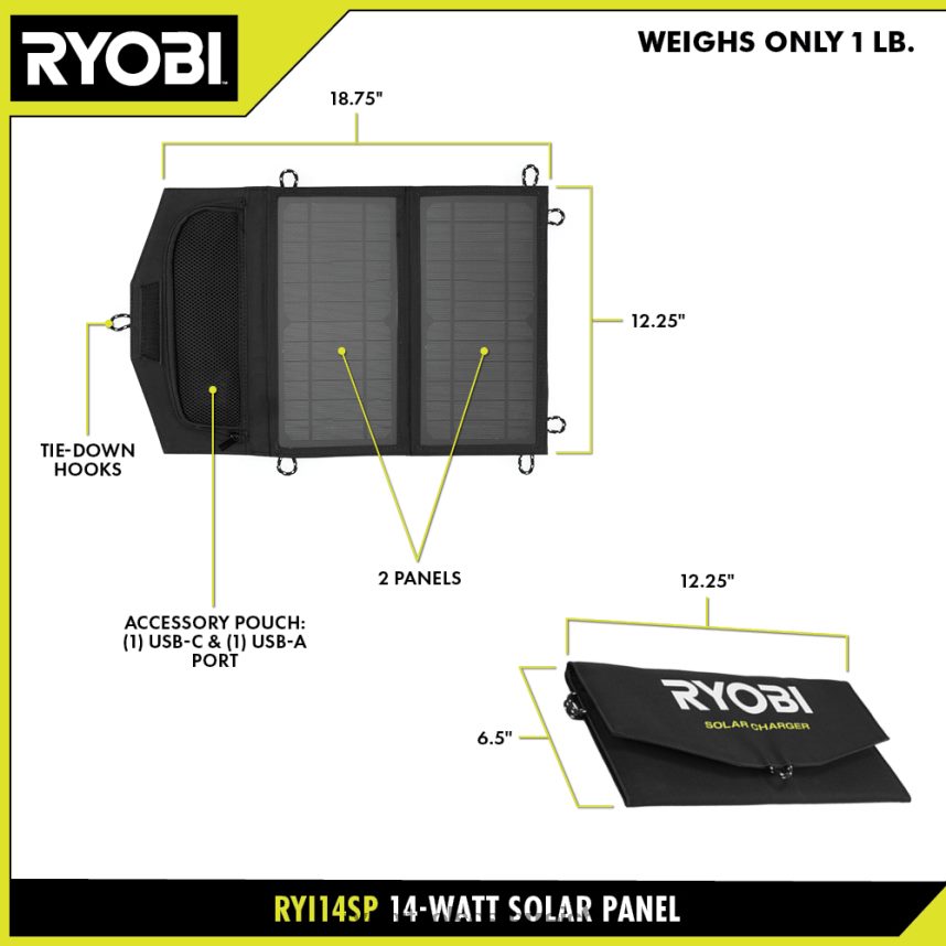 Das faltbare 14-Watt-Solarpanel von Ryobi versorgt jedes kleine elektronische Gerät mit einem USB-A- oder USB-C-Anschluss direkt von der Sonne mit Strom. Es ist ideal für die Stromversorgung Ihrer Telefone, Tablets, Powerbanks, Lautsprecher und sogar Ihrer Ryobi 18V One+-Batterien, wenn es mit einer kompatiblen Ryobi-Stromquelle kombiniert wird. Es kann einen Ryobi 18V One+ 2Ah Akku in weniger als 4 Stunden und Ihr Telefon in nur 2 Stunden und 20 Minuten aufladen. Das 14-Watt-Solarpanel maximiert die Mobilität Ihrer Stromquelle, wiegt nur 0,5 kg und misst im zusammengeklappten Zustand 31 x 16,5 cm. Das kompakte, leichte und faltbare Design erleichtert die Aufbewahrung und den Transport, sodass Sie es zum Aufladen von Geräten beim Wandern, Camping, am Strand und überall in der Sonne mitnehmen können, wo Sie tragbare Stromversorgung benötigen. es kann offen seinSie können es flach auf dem Boden aufstellen, um während der Hauptsonnenstunden das Licht einzufangen, oder es kann mithilfe der (7) integrierten Aufhängeösen in verschiedenen Winkeln aufgehängt werden, um die Lichtmenge zu maximieren, die es einfängt. Für das 14-Watt-Solarpanel von Ryobi gilt die 3-jährige Herstellergarantie von Ryobi. Außerdem sind das faltbare 14-Watt-Solarpanel Ryobi und eine Bedienungsanleitung enthalten.
