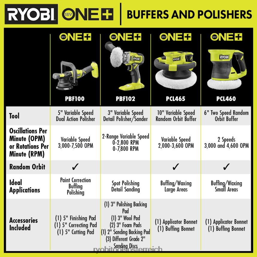 Erweitern Sie Ihr Ryobi 18V One+-System mit dem 18V One+ 10”-Random-Orbit-Puffer mit variabler Geschwindigkeit. Dieses Werkzeug wurde für die Bearbeitung großer Flächen entwickelt und kann ein Fahrzeug in voller Größe mit einer Laufzeit von bis zu 2 1/2 Stunden polieren. Der variable Geschwindigkeitsregler bietet eine bessere Kontrolle von bis zu 3.600 Umdrehungen pro Minute und die zufällige Umlaufbewegung sorgt für ein verwirbelungsfreies Finish. Mit dem Multi-Grip-Design für ultimativen Komfort und Kontrolle können Sie eine Vielzahl von Projekten einfacher erledigen. Das Beste daran ist, dass es Teil des Ryobi 18V One+-Systems mit über 280 kabellosen Produkten ist, die alle mit derselben Batterieplattform funktionieren. Dieser 18V One+ 10” Orbitalpuffer mit variabler Geschwindigkeit ist durch die 3-jährige Herstellergarantie von Ryobi abgesichert und umfasst (1) PCL465 18V One+ 10” Variable Speed Random Orbitalpuffer, Applikatorhaube, Polierhaube und OPHandbuch des Erstellers. Akku und Ladegerät sind separat erhältlich.