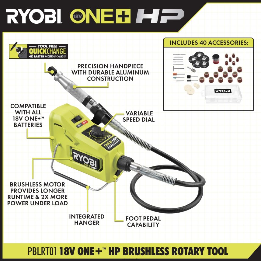 ryobi stellt das One+ HP 18V bürstenlose Akku-Rotationswerkzeug vor. Das one+ hp Rotationswerkzeug ist so konzipiert, dass es den professionellen Erwartungen gerecht wird und eine leistungsstarke Lösung mit längerer Laufzeit und 2-mal mehr Leistung unter Last bietet. Mit dem variablen Geschwindigkeitsregler können Benutzer zwischen 1.000 Nenn-U/min und bis zu 25.000 Nenn-U/min wählen und so maximale Präzision und Genauigkeit für alle Anwendungen gewährleisten. Das Präzisionshandstück besteht aus einer hochwertigen Aluminiumkonstruktion und verfügt über die neue innovative Schnellwechselspannzange mit 4-mal schnellerem Zubehörwechsel, wodurch der Zubehörwechsel schnell und einfach erfolgt. Dieses Werkzeug ist außerdem mit Fußpedalen kompatibel und bietet unübertroffene Präzision und Kontrolle. Dieses Rotationswerkzeug verfügt über eine 3-jährige Herstellergarantie von Ryobi und beinhaltet eine 36 Zoll flexible Welle, 40 Schleif-/Schneid-/Schleif-/Polierzubehörteile, ein Aufbewahrungskoffer für Zubehör, ein Schraubenschlüssel und eine Bedienungsanleitung. Akku und Ladegerät sind separat erhältlich.