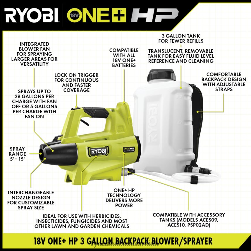 - Sprühen Sie bis zu 28 Gallonen pro Ladung bei ausgeschaltetem Lüfter oder 5 Gallonen pro Ladung mit Lüfter Einschalten mit einer Ryobi 18V One+ 2Ah-Batterie