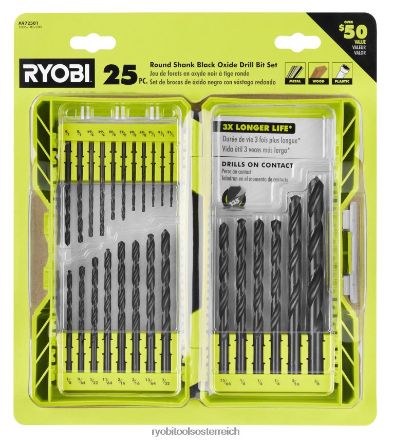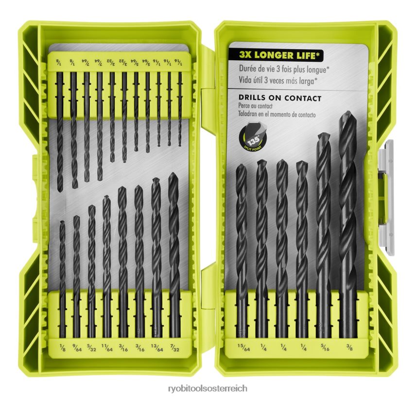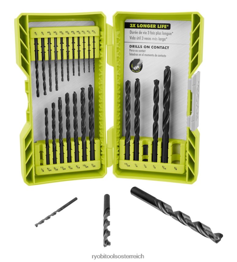 Ryobi stellt das 25-teilige Rundschaft-Bohrerset aus schwarzem Oxid vor. Dieses Sortiment an Bohrern eignet sich perfekt für Materialien wie Holz-, Metall- und Kunststoffoberflächen. Die Bits bestehen aus Schnellarbeitsstahl mit einer schwarzen Oxidoberfläche, um eine überlegene Haltbarkeit und eine dreimal längere Lebensdauer zu bieten. Ein weiteres Merkmal dieser Bohrer ist die 135-Grad-Splitspitze, um bei Kontakt zu bohren und zu verhindern, dass Ihr Bohrer wandert. das kompakte Gehäuse für einfachen Bit-Zugang und Mobilität. Dieses breite Sortiment umfasst Bits von 1/16 Zoll bis 3/8 Zoll für alle Ihre Heimwerkerprojekte. Dieses Set enthält (3) 1/16-Zoll-Bohrer aus schwarzem Oxid, (2) 5/64-Zoll-Bohrer aus schwarzem Oxid, (2) 3/32-Zoll-Bohrer aus schwarzem Oxid, (2) 7/64-Zoll-Bohrer aus schwarzem Oxid , (3) 1/8″ schwarzer Oxidbohrer, (1) 9/64″ schwarzer Oxidbohrer, (1) 5/32″ schwarzer Oxidbohrer, (1) 11/64-Zoll-Bohrer aus schwarzem Oxid, (2) 3/16-Zoll-Bohrer aus schwarzem Oxid, (1) 13/64-Zoll-Bohrer aus schwarzem Oxid, (1) 7/32-Zoll-Bohrer aus schwarzem Oxid, (1) 15 /64-Zoll-Bohrer aus schwarzem Oxid, (3) 1/4-Zoll-Bohrer aus schwarzem Oxid und (1) 5/16-Zoll-Bohrer aus schwarzem Oxid, (1) 3/8-Zoll-Bohrer aus schwarzem Oxid.