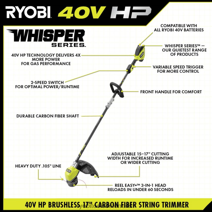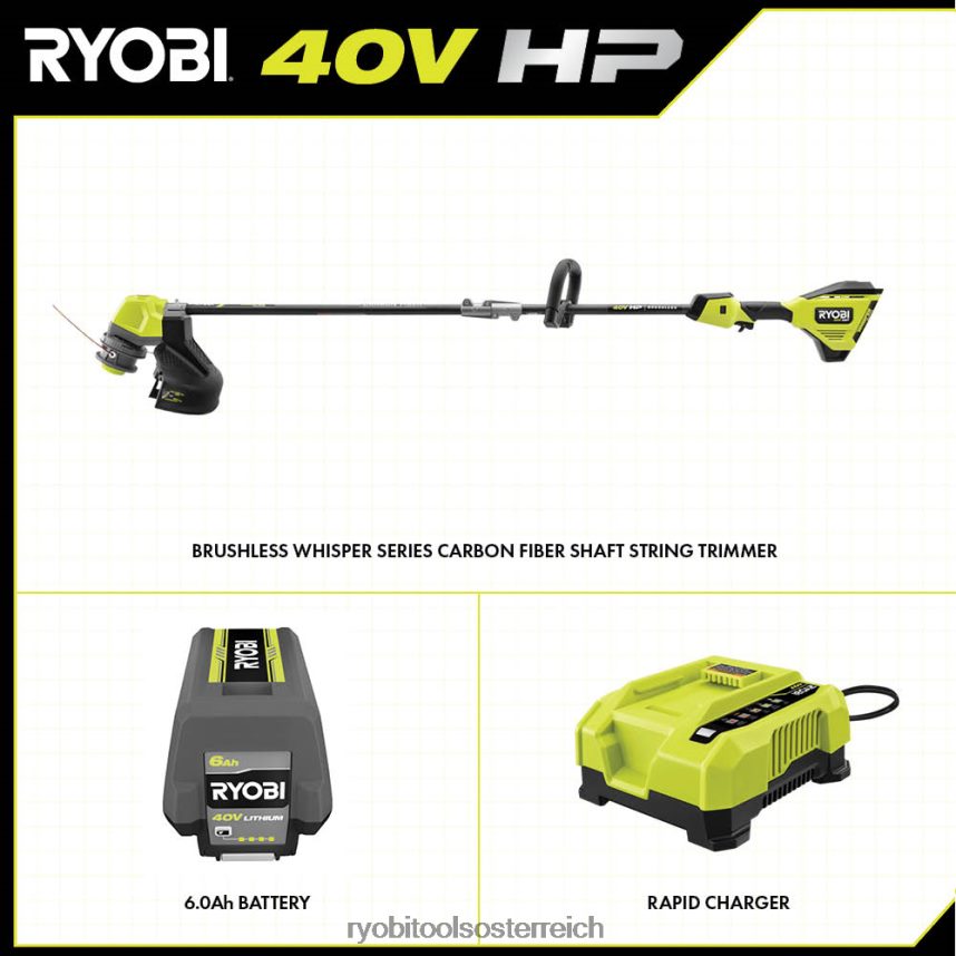 Steigen Sie mit dem bürstenlosen 40-V-HP-Fadentrimmer-Kit mit 17-Zoll-Carbonfaserschaft in das 40-V-System von Ryobi ein. Die 40-V-PS-Technologie liefert mehr Leistung als ein 30-cm3-Gas-Fadenschneider. Die 40-V-HP-Technologie kombiniert einen bürstenlosen Motor, fortschrittliche Elektronik und Hochleistungs-Lithium-Technologie, um mehr Leistung, Laufzeit und Haltbarkeit mit bis zu 67 Minuten Laufzeit zu bieten. Dieser Rasentrimmer bewältigt Ihre aggressivsten Schnitte mit dem verstellbaren 15- bis 17-Zoll-Schnittschwad und dem robusten 0,105-Zoll-Faden, ideal für hartnäckiges Unkraut, dichtes Gras und Gestrüpp. Als Teil der Whisper-Serie ist er 72 % leiser als Gas, sodass Sie zu jeder Tageszeit schneiden können, ohne andere zu stören. Für zusätzliche Haltbarkeit ist dieser Fadenschneider mit einem Schaft aus Kohlefaser ausgestattet. Laden Sie Ihre Leitung bequem in weniger als 60 Sekunden aufnds mit dem Reel Easy+ 3-in-1 Bump-Feed-Kopf. Ihr 40-V-6-Ah-Akku wird mit dem mitgelieferten 40-V-Schnellladegerät in weniger als 60 Minuten aufgeladen, sodass Sie schnell wieder mit dem Trimmen beginnen können. Das Beste ist, dass es Teil des Ryobi 40-V-Systems ist, bei dem jede 40-V-Batterie mit jedem 40-V-Produkt funktioniert. Dieses bürstenlose 40-V-HP-Fadentrimmer-Kit mit 17-Zoll-Carbonfaserschaft verfügt über eine 5-jährige Herstellergarantie auf das Werkzeug von Ryobi und eine 3-jährige Herstellergarantie auf den Akku und umfasst den bürstenlosen 40-V-HP-Fadentrimmer mit Carbonfaserschaft Ry402011 und die 40-V-6-Ah-Lithiumbatterie OP40605. op406 40-V-Schnellladegerät, Trimmerzubehör und Bedienungsanleitungen.