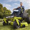 Besuchen Sie die interaktive Landingpage, um mehr über diesen Aufsitzmäher zu erfahren. Die Zukunft des Mähens hat eine Wende genommen. Der elektrische Aufsitzmäher Ryobi zt480ex nutzt die Zero-Turn-Technologie mit Überlappungslenkung, um mehr Fläche in kürzerer Zeit abzudecken. Er schneidet bis zu 3 Hektar mit einer Ladung und verändert leise und schnell die Art und Weise, wie Amerika mäht. Durch einfaches Drücken der Lenkstange wird ein unerbittliches Drehmoment direkt an die leistungsstarken bürstenlosen Motoren übertragen. Sie treiben die Räder und Messer leise an, ohne lästige Riemen, Zündkerzen, Benzin und Dämpfe. Mobilfunkdienst in ausgewählten Regionen verfügbar. Wenn Ihr Aufsitzmäher Aufmerksamkeit erfordert, kann ein zertifizierter Ryobi-Supporttechniker die Diagnose und Wartung direkt von zu Hause aus durchführen. Für einige Dienste ist möglicherweise Folgendes erforderlichWir bitten Sie, Ihren Mäher zu einem der über 300 Servicezentren im ganzen Land zu bringen. Dieser funktionsreiche Mäher bietet außergewöhnliche Leistung, Komfort, Komfort und Haltbarkeit. Geben Sie nichts als Benzin ab!