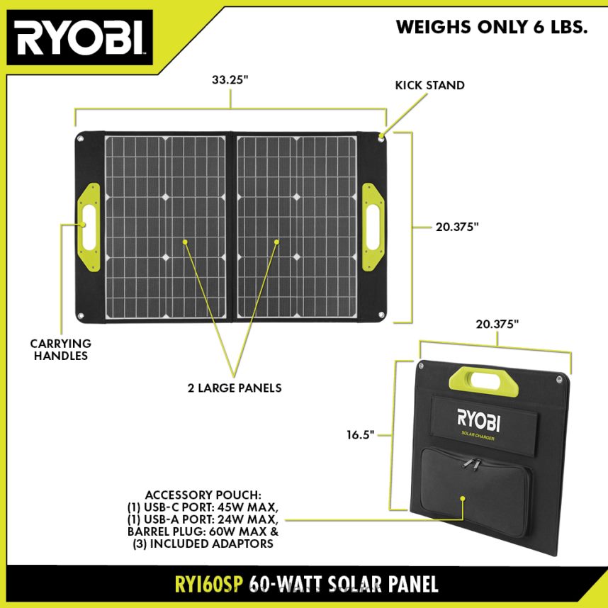 Das faltbare 60-Watt-Solarpanel von Ryobi versorgt jedes kleine elektronische Gerät mit einem USB-A- oder USB-C-Anschluss direkt von der Sonne mit Strom. Für zusätzliche Kompatibilität versorgt es mit dem Hohlstecker und den Adaptern auch eine Vielzahl anderer Elektronikgeräte mit Strom. Es ist ideal für die Stromversorgung Ihrer Telefone, Tablets, Powerbanks, Lautsprecher und sogar Ihrer Ryobi 18V One+-Batterien, wenn es mit einer kompatiblen Ryobi-Stromquelle kombiniert wird. Koppeln Sie es mit der Ryobi 18V One+ Ryi818bg Power Station, um bis zu 8 Batterien nacheinander mit Solarenergie aufzuladen. Dieses Solarpanel kann einen Ryobi 18V One+ 2Ah Akku in weniger als 1 Stunde und Ihr Telefon in nur 1 Stunde und 15 Minuten aufladen. Das kompakte, faltbare Design erleichtert die Aufbewahrung und den Transport, sodass Sie es zum Aufladen von Geräten beim Camping usw. mitnehmen könnenAuf der Baustelle und überall dort, wo Sie tragbare Stromversorgung benötigen. Maximieren Sie die Lichtmenge, die die Paneele einfangen, indem Sie den frei verstellbaren Ständer oder die (4) sicheren Ösen verwenden. Für das 60-Watt-Solarmodul von Ryobi gilt die 3-jährige Herstellergarantie von Ryobi. Es umfasst das faltbare 60-Watt-Solarmodul Ryi60SP, Zylindersteckeradapter und eine Bedienungsanleitung.