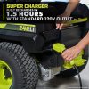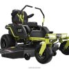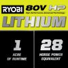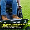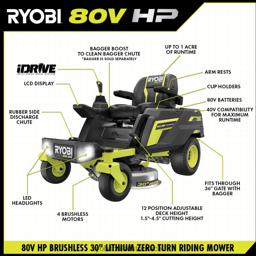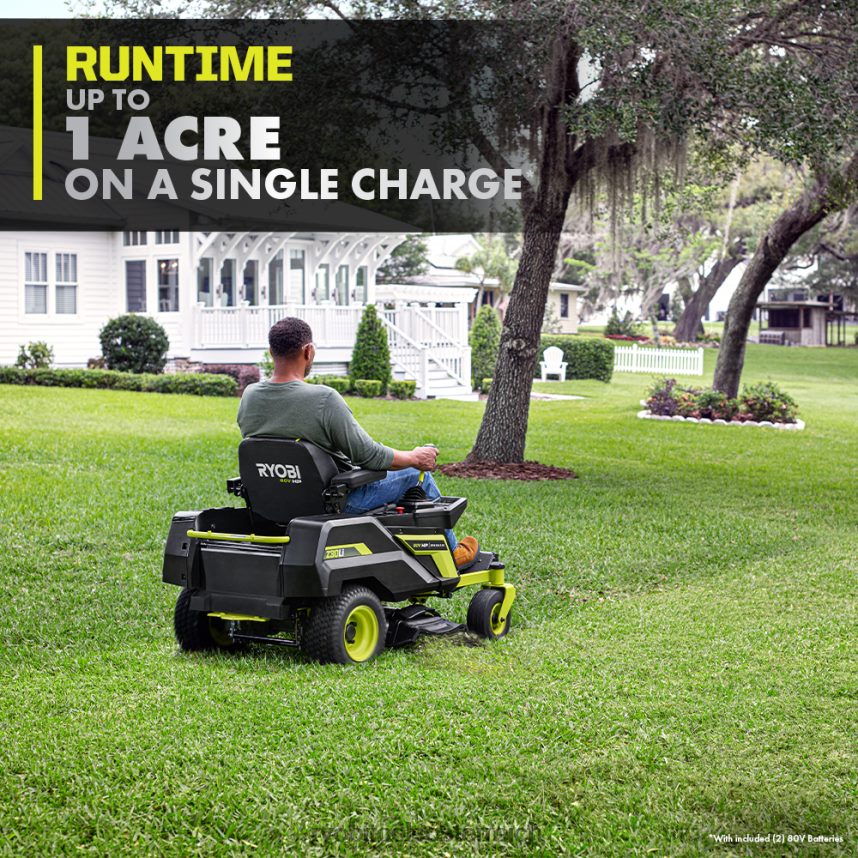 Wir stellen Ryobis ersten Zero-Wende-Aufsitzrasenmäher mit Lithium-Ionen-Akku vor, den Ryobi 80V HP 30″ Lithium Electric ZTR.* HP-Technologie und 80V-Batterien liefern zusammen die Leistung von 28 PS Benzinmotor*, während der Aufwand und die Wartung eines Gasmähers entfallen. Dieser Aufsitzmäher schneidet mit Hilfe von 4 bürstenlosen Motoren und (2) 80-V-10-Ah-Batterien bis zu 1 Acre pro Ladung, mit einem Hyperladegerät, das sich in 1,5 Stunden vollständig auflädt Sie sind bereit für Ihren nächsten Job. Das revolutionäre iDrive-System nutzt eine intuitive Einhand-Joystick-Steuerung, um Objekte einfacher zu manövrieren als ein herkömmlicher ZTR. Der innovative LCD-Bildschirm zeigt Laufzeit, Akkulaufzeit und mehr an, während die Aufsitzmäher-App verfügbar ist ermöglicht die Überwachung der Ladezeit und der Akkulaufzeit aus der Ferne. Die 12-Punkt-Höhenverstellungermöglicht die Wahl der perfekten Schnitthöhe zwischen 1,5 und 4,5 Zoll. Dieser Mäher ist mit dem kompatiblen Bagger-Boost-Zubehör, das den Schacht per Knopfdruck schnell freigibt, weiterhin führend in der Innovation. Das 30-Zoll-Deck und der seitliche Gummiauswurfkanal ermöglichen es diesem Aufsitzmäher, durch ein standardmäßiges 36-Zoll-Tor zu passen, und erleichtern das Manövrieren im Landschaftsbau. Dieser Rasenmäher wurde im Hinblick auf Komfort und Bequemlichkeit entwickelt und verfügt über einen Premium-Sitz, einen USB-Anschluss zum Aufladen von Telefonen, ein Ablagefach und LED-Scheinwerfer. Mobilfunkdienst in ausgewählten Regionen verfügbar. Wenn Ihr Aufsitzmäher Aufmerksamkeit erfordert, kann ein zertifizierter Ryobi-Supporttechniker die Diagnose und Wartung direkt von zu Hause aus durchführen. Bei einigen Diensten kann es erforderlich sein, dass Sie Ihren Mäher zu einem der über 300 Servicezentren im ganzen Land bringen. Dank des bürstenlosen 30-Zoll-Lithium-Elektro-Zero-Turn-Aufsitzmähers mit 80 V PS von Ryobi wird die Rasenpflege nie mehr die gleiche sein.