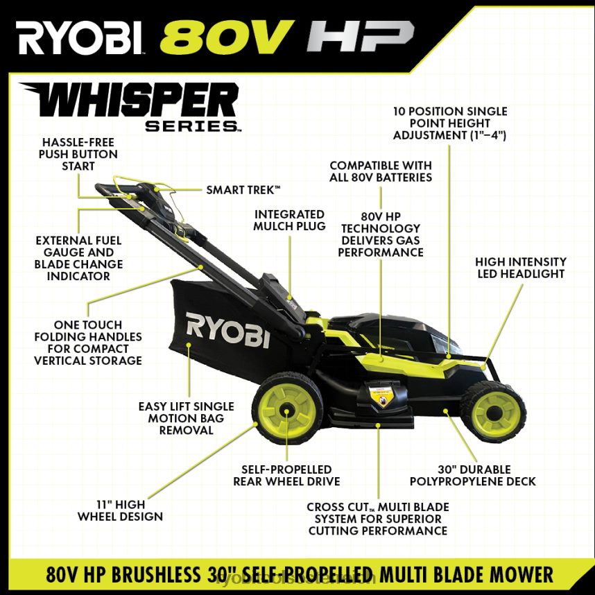 Der bürstenlose 30-Zoll-Querschnitt-Rasenmäher der Whisper-Serie mit 80 V HP von Ryobi nutzt die 80-V-HP-Technologie, um mit der Leichtigkeit der 80-V-Batterieleistung von Ryobi ein effizienteres Schneiderlebnis als mit Benzin zu bieten. Der 80 V PS Die Technologie liefert 35 % mehr Leistung im Vergleich zur Gasleistung, wodurch dieser neue 30-Zoll-Rasenmäher leistungsstärker ist als ein 223-cm3-Benzinmäher. Als Teil der Whisper-Serie, der leisesten Produktreihe von Ryobi, ist dieser Rasenmäher 70 % leiser als ein Benzinmäher. Mit einem einfachen Start per Knopfdruck können Benutzer bis zu 1 Acre mit bis zu 90 Minuten Laufzeit mit der mitgelieferten Ryobi 80 V 10 Ah Lithiumbatterie bewältigen. Die externe Ladestandsanzeige zeigt die verbleibende Batterielebensdauer beim Mähen an, und wenn es Zeit zum Aufladen ist, kann das mitgelieferte 80-V-Hyper-Ladegerät die Batterie in weniger als einer Stunde aufladen. Dieser Mäher ist Teil des RyobiBürstenlose 80-V-PS-Familie kabelloser Produkte. Wenn die Arbeit abgeschlossen ist, ermöglicht die einfache Entfernung des Hebesacks das schnelle und bequeme Entleeren des Grasschnitts. Mit den One-Touch-Klappgriffen kann dieser Rasenmäher zwischen den Mähvorgängen problemlos in der Garage oder im Schuppen verstaut werden. Ein 11-Zoll-Hochraddesign und hochintensive LED-Scheinwerfer in Kombination mit der Technik der Whisper-Serie ermöglichen es Benutzern, jederzeit von der Dämmerung bis zum Morgengrauen zu mähen. Für diesen Mäher gilt eine Herstellergarantie von fünf Jahren.