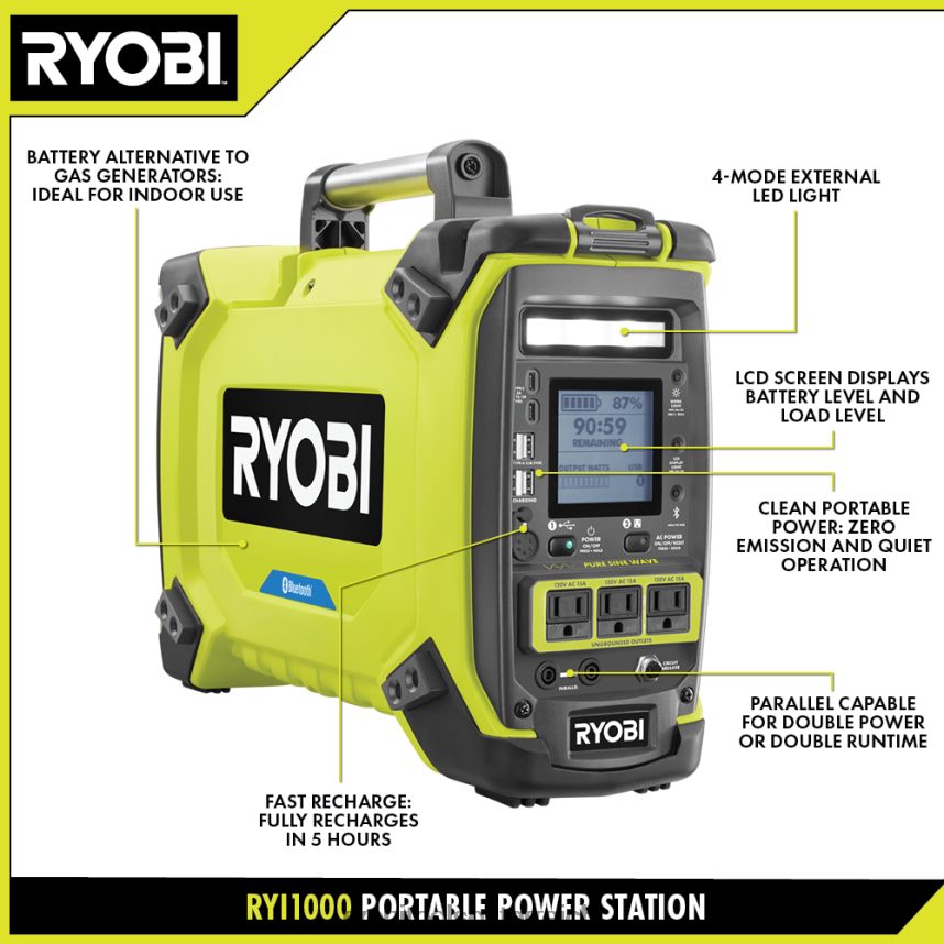 Das tragbare 1800-Watt-Kraftwerk von Ryobi liefert mit seinem internen 1094-Wattstunden-Akku 1800 Betriebswatt und 3000 Startwatt sauberen, tragbaren Strom. Egal, ob Sie auf der Baustelle sind, in einer abgelegenen Gegend campen oder zu Hause während eines Stromausfalls sind, diese Energiestation ist perfekt, um Ihre Geräte am Laufen zu halten. Dieses Gerät kann Geräte wie Mobiltelefone, Laptops, Lampen und sogar Fernseher und Kühlschränke mit Strom versorgen. Betreiben Sie einen großen Kühlschrank bis zu 18 Stunden lang oder einen 32-Zoll-LED-Fernseher bis zu 30 Stunden lang. Dank seines leisen Betriebs und der Nullemissionen ist dieses Kraftwerk sicher für die Verwendung in Innenräumen. Die reine Sinuswellentechnologie ermöglicht eine saubere Stromabgabe und sorgt so für Kompatibilität mit empfindlicher Elektronik. Geräte mit Strom versorgen und den eingebauten Akku des Geräts gleichzeitig aufladenGleichzeitig mit der Pass-Through-Ladetechnologie. Überwachen Sie die Wattleistung und den Batteriestand des Kraftwerks bequem auf Ihrem Smartphone mit der Gencontrol-App. Für das tragbare Kraftwerk RYI1000 gilt eine dreijährige Herstellergarantie. Es umfasst das Kraftwerk, ein 270-Watt-Wechselstrom-Ladegerät, eine Schutzhülle und Bedienungsanleitungen.